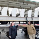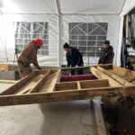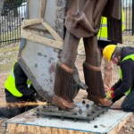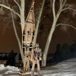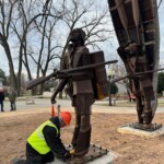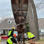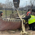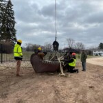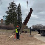 The park acquired the structure in 2017 with the goal to restore and resurrect the artfully welded piece. Structural damage proved to be extensive. Professional and Heritage Hill staff welders took care to make the sculpture structurally sound, and repair the weather and rodent damage, while, most importantly, preserving the artistic integrity. On Tuesday, December 6th, 2022 the Lyndon Fayne Pomeroy Sculpture of two voyageurs and their canoe, which formerly stood on the corner of Cherry St. and Monroe Ave., was erected in its permanent home at Heritage Hill.
