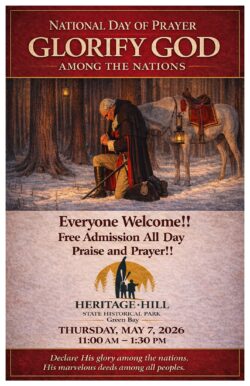 The first Thursday in May has been designated as the National Day of Prayer across America. This is the 75th Annual National Day of Prayer. This event is open to everyone who would like to join with others in worship and prayer. Heritage Hill Historical State Park will be open from 9-4pm, and for those coming for the National Day of Prayer, there will be free admission. The Moravian Church will be open all day for prayer and reflection. Between 11-1:30pm there will be a concentrated time of praise music and singing integrated with short yet specific prayer for families, our youth and college students, education and teachers, addictions, homelessness, righteous leaders, law enforcement, military, the Church, NE Wisconsin and America. As the nation celebrates 250 years of the signing of the Declaration of Independence on July 4, this is a perfect time to come out and pray for our nation.